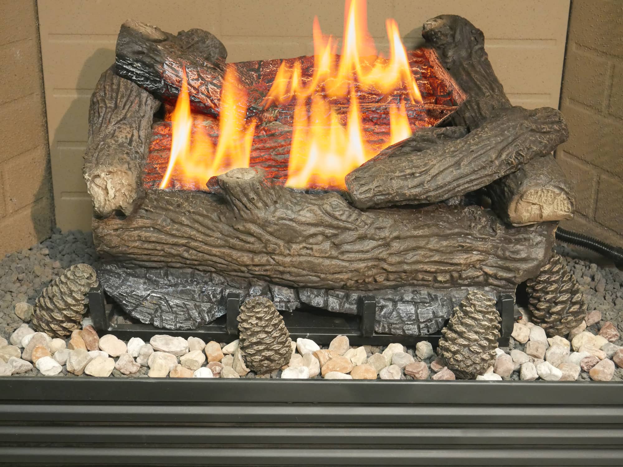 These Pine Cones are made of the same ceramic material as our gas log sets. These pine cones can be stacked in with any manufacturer's vented gas log sets. They can also be placed on the floor inside the fireplace with both vented and vent free gas log sets.