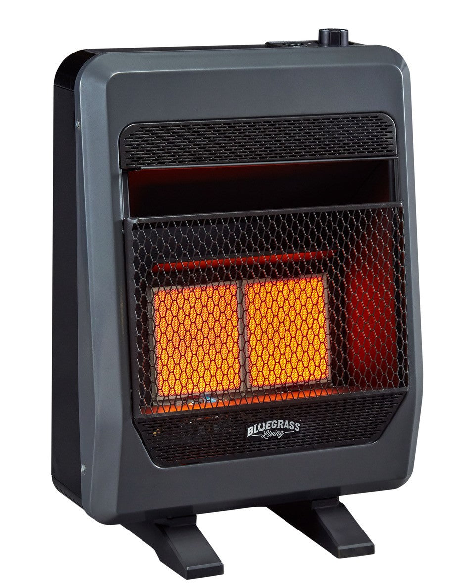 The Bluegrass Living ventless infra-red radiant gas wall space heater operates on Liquid Propane Gas and gives you 18,000 Maximum BTU of reliable supplemental heat that can heat up to 950 sq. ft of living space. The space heater is perfect for not only just taking the chill out of the room but also for keeping your area warm on even the coldest winter days.