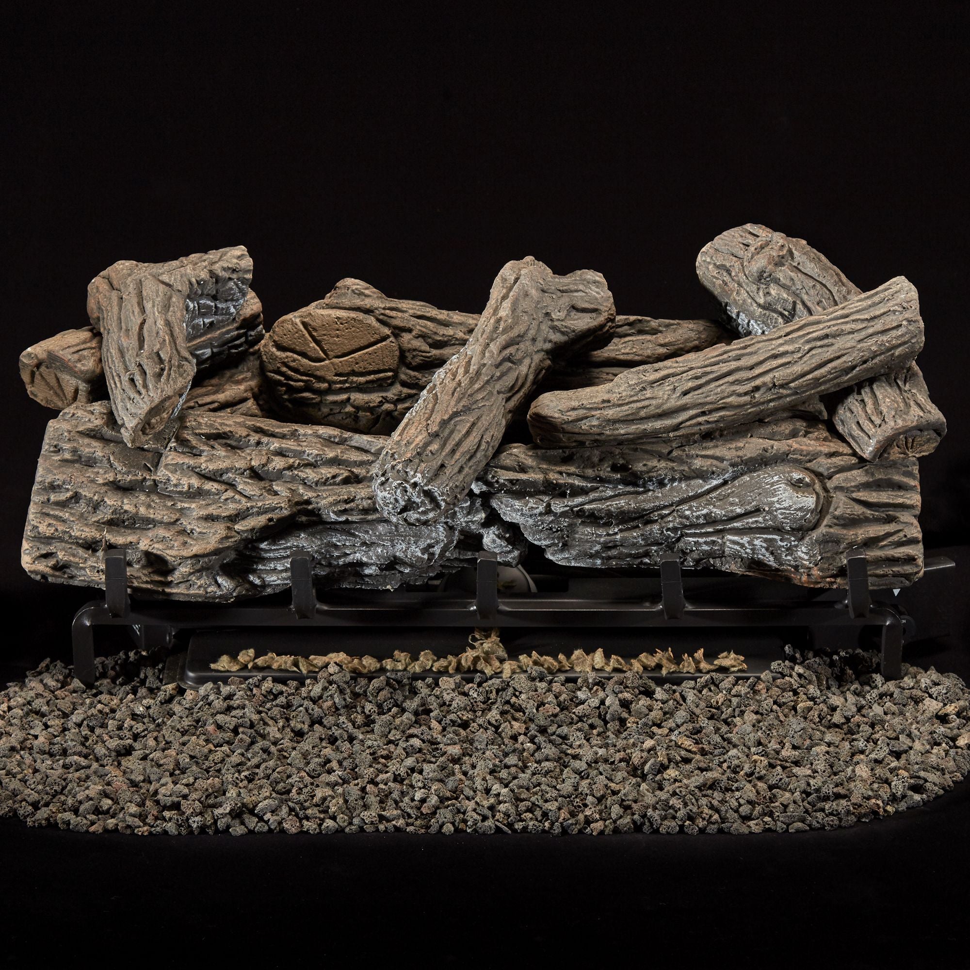 The Bluegrass Living Stacked Oak Ventless Log Set features Natural Gas Log Set. This unique log set offers a natural look and feel of a real wood-burning fireplace. The log set was developed from real wood to reflect a bark stack with focus on blending bark and split features along with charring to create an exquisite look to your fireplace and magnify the beauty of your home. The Thermostatic Remote Control feature can easily regulate the 33,000 BTU to create the perfect heat setting for your home.
